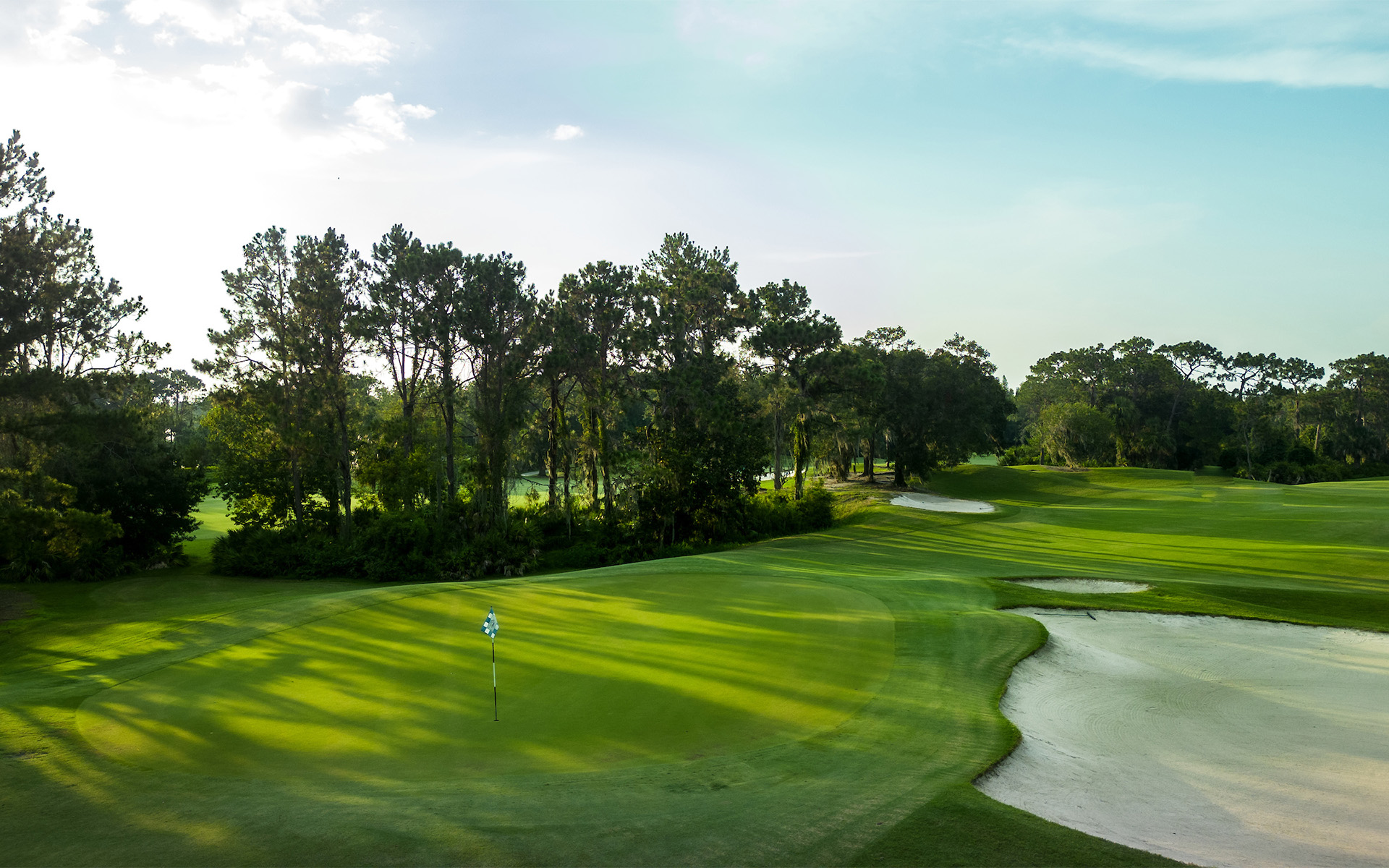 Nestled in lush Florida, Tom Fazio's golf course suits all skill levels. Carved from wetlands and pine forests, it features manicured tees, fairways leading to challenging TifEagle greens. Unlike typical Florida courses, sand bunkers, not water hazards, add challenge for a unique golfing experience. Noteworthy holes like the par-3 4th and par-4 6th contribute to a fair yet challenging adventure, culminating in the signature par-4 18th hole with its water-lined fairway and breathtaking views of the clubhouse from the final green.