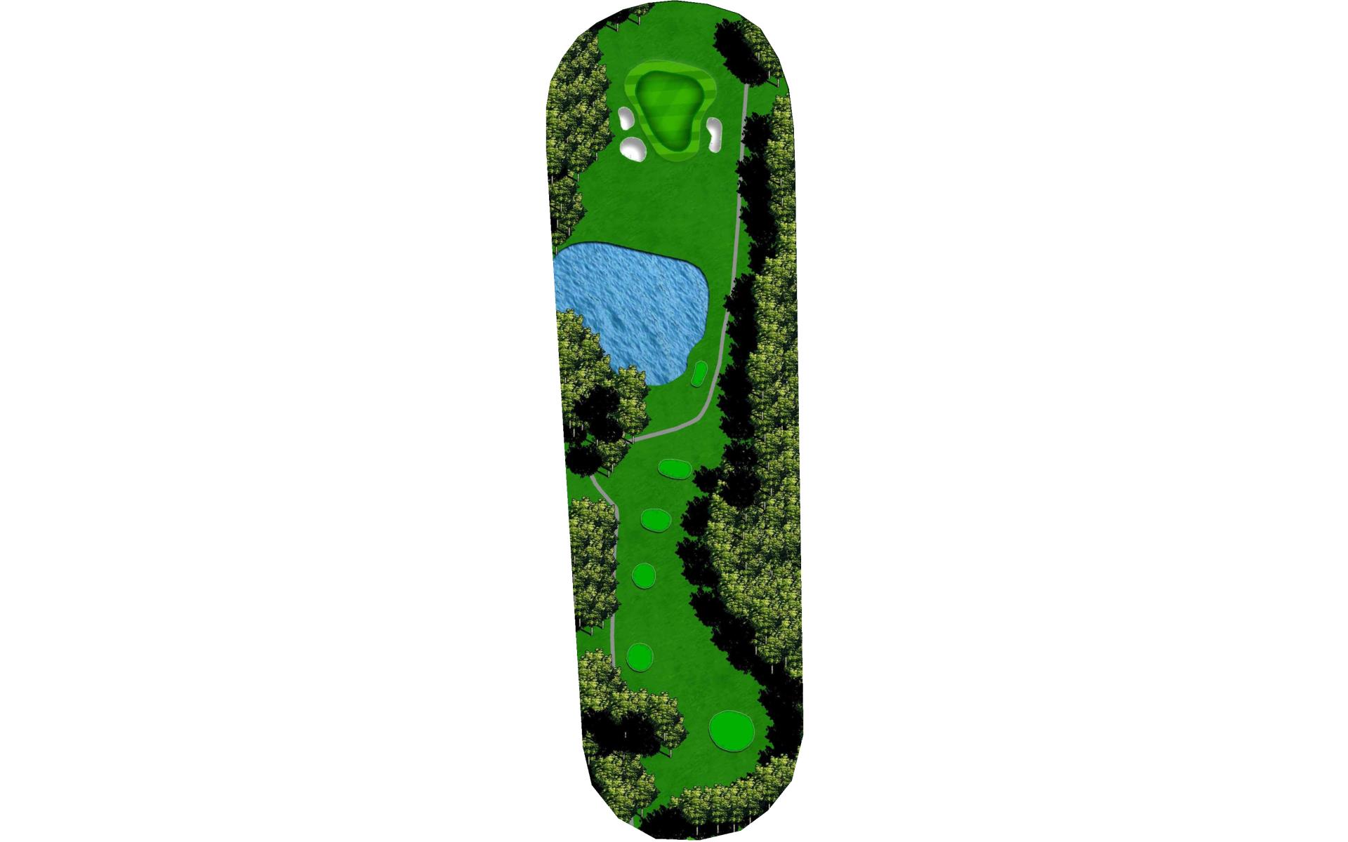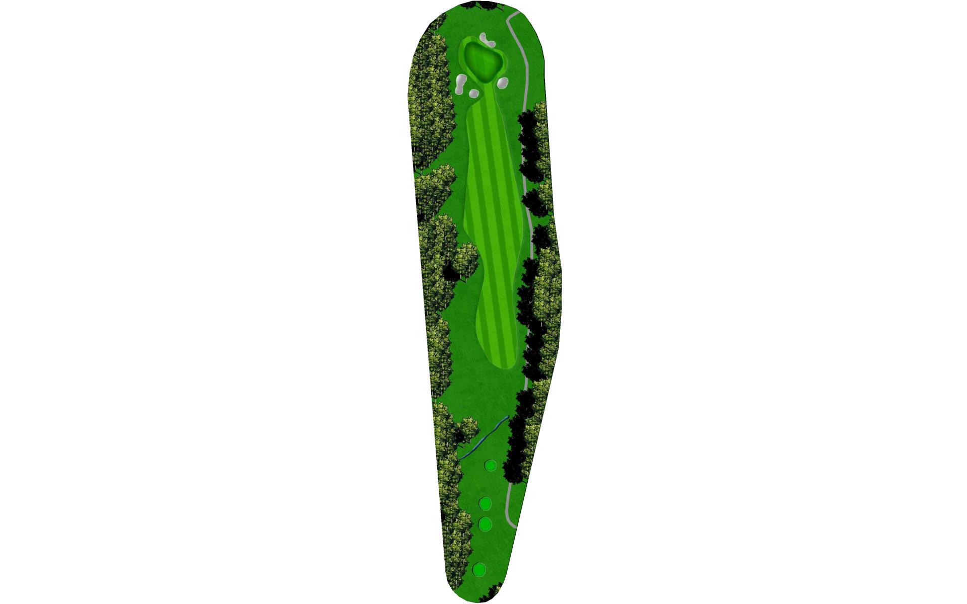 The right side fairway bunkers are 180 yards from the tee and a 230 yard shot is required to carry both bunkers. A tee shot right of the fairway bunkers will generally kick right OB. The left fairway bunker is - 245 yards from the tee. A tee shot up the left side of the fairway will give you a good angle to green with a large slope on the front left portion of the green. Green depth is 34 paces.